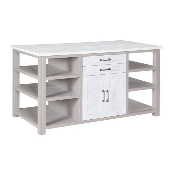 At its centre you will find 4 drawers (2 on each side) and a large storage cupboard with 2 doors on either side. Apart from that, there are 3 open shelves on each side of the kitchen island.