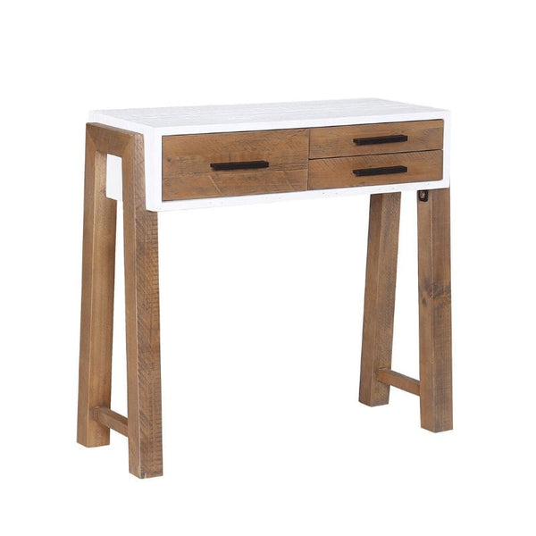 - Bring a touch of Scandinavian-inspired style into your home with our beautifully crafted console table. The unique combination of reclaimed "weathered wood" and sleek white surfaces creates a modern and stylish look that will elevate any hallway or living room. This is a must-have piece for any design-savvy homeowner looking to add a touch of rustic yet contemporary charm to their space.