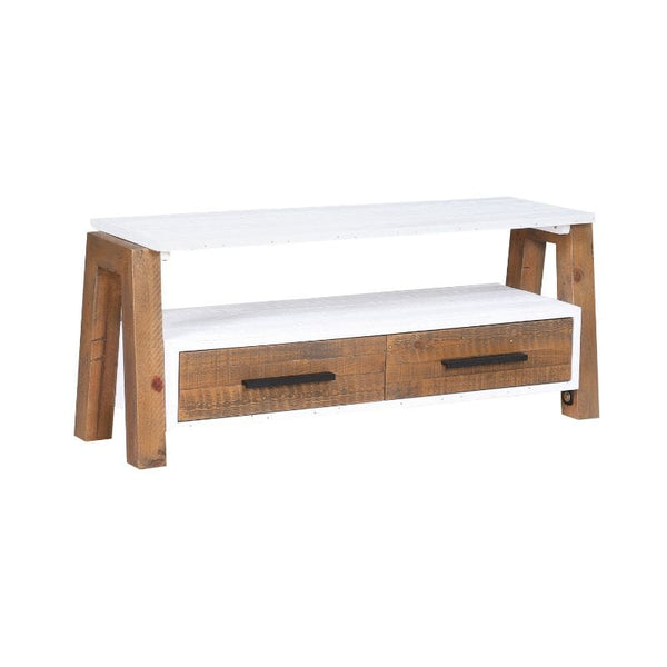 - Upgrade your living room with the Trinity Two Tone Distressed White Widescreen TV Unit 110cm. This sleek and chic TV cabinet is perfect for adding a touch of Scandinavian inspiration to your home decor. The unique blend of "weathered wood" and modern white surfaces adds a rustic yet contemporary feel to any space. With 2 drawers and 1 open shelf, this TV stand not only elevates the look of your living room, but also provides convenient storage for all your entertainment essentials. Say goodbye to cluttered cords and hello to organized elegance with the Trinity Two Tone Distressed White Widescreen TV Unit 110cm.