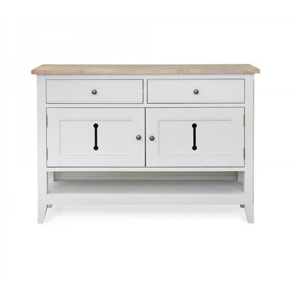 - This versatile sideboard/console table offers exceptional storage with a cupboard, two drawers, and an open shelf. The uniquely designed doors not only add stylish flair, but also provide ventilation. Place it in a hallway with a mirror above for a stunning look, or use it in any other space for added functionality and beauty.
