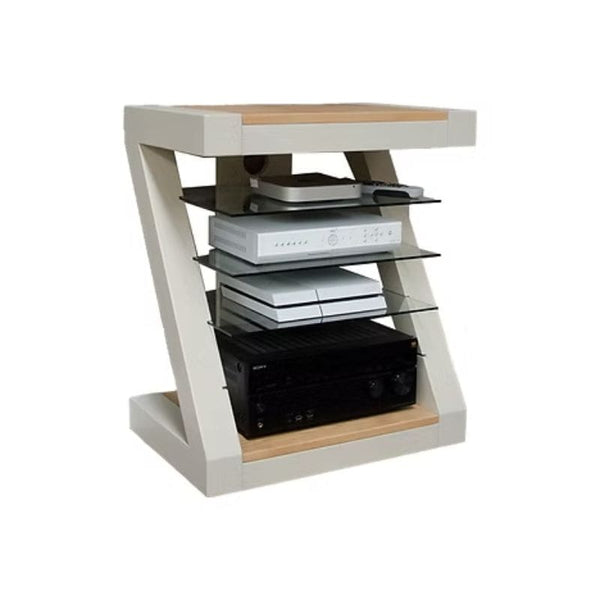 - This Z Shaped HiFi Cabinet boasts four removable tempered glass shelves, providing endless options for your devices. The blend of painted pine and lacquered oak gives the unit a sleek and modern feel.